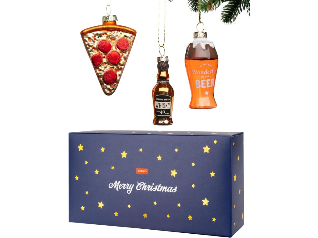 Originálna darčeková sada sklenených vianočných ozdôb – pizza, whisky a pivo (3 ks v krabičke)