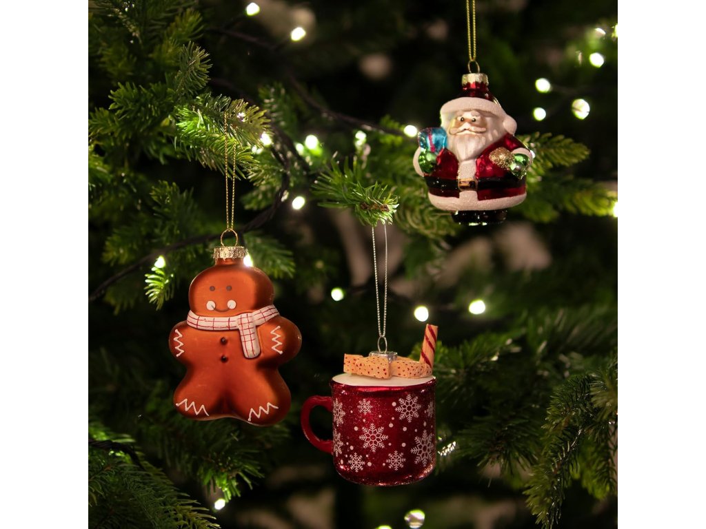 Originálna darčeková sada sklenených vianočných ozdôb – perníček, hrnček kakaa a Santa Claus (3 ks v krabičke)