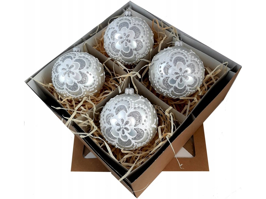 Ručne zdobené sklenené vianočné gule – biely set s kvetinovým motívom a strieborným leskom (4 ks, Ø 10 cm)