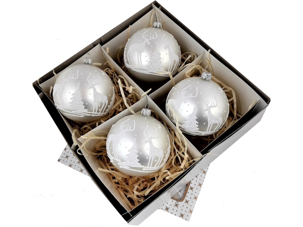 Ručne zdobené sklenené vianočné gule – biely set s jeleňmi a stromčekom (4 ks, Ø 10 cm)