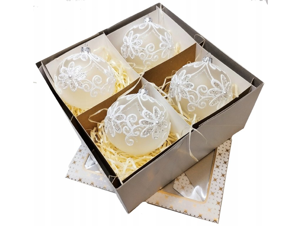 Ručne zdobené sklenené vianočné gule – šampanský set s perlovo-kvetinovým motívom (4 ks, Ø 10 cm)