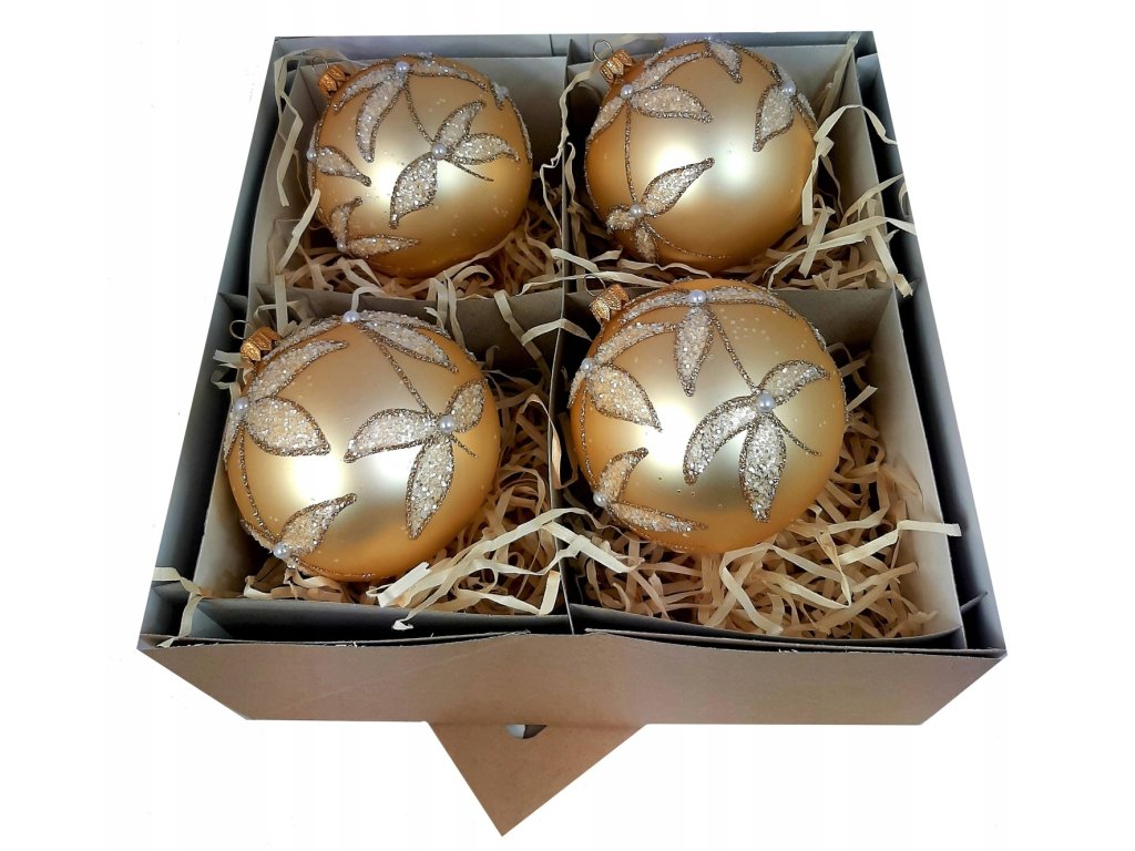 Ručne zdobené sklenené vianočné gule – zlatý set s perličkami a listovým motívom (4 ks, Ø 10 cm)