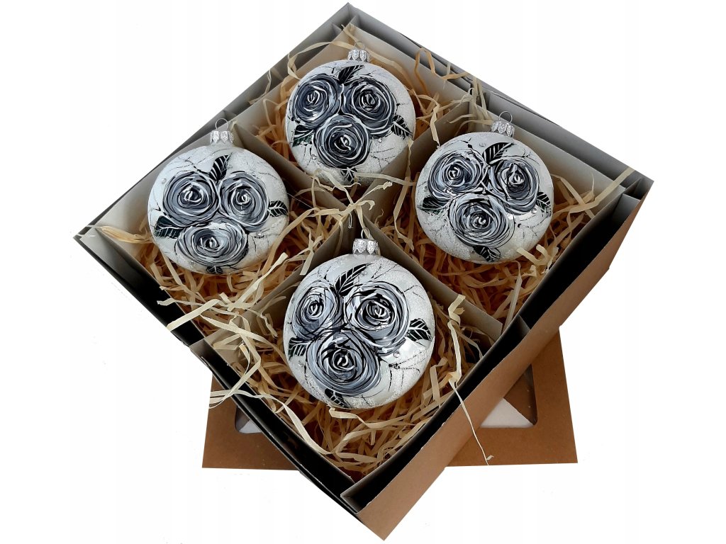 Tento výnimočný set predstavuje spojenie umeleckého štýlu a tradičného remesla. Každá guľa je ručne maľovaná jemnou technikou v odtieňoch sivej, bielej a čiernej, pričom motív ruží pôsobí ako malé dielo na skle. Dekor je zvýraznený decentným leskom a matným podkladom, ktorý ešte viac zvýrazňuje prepracované detaily.