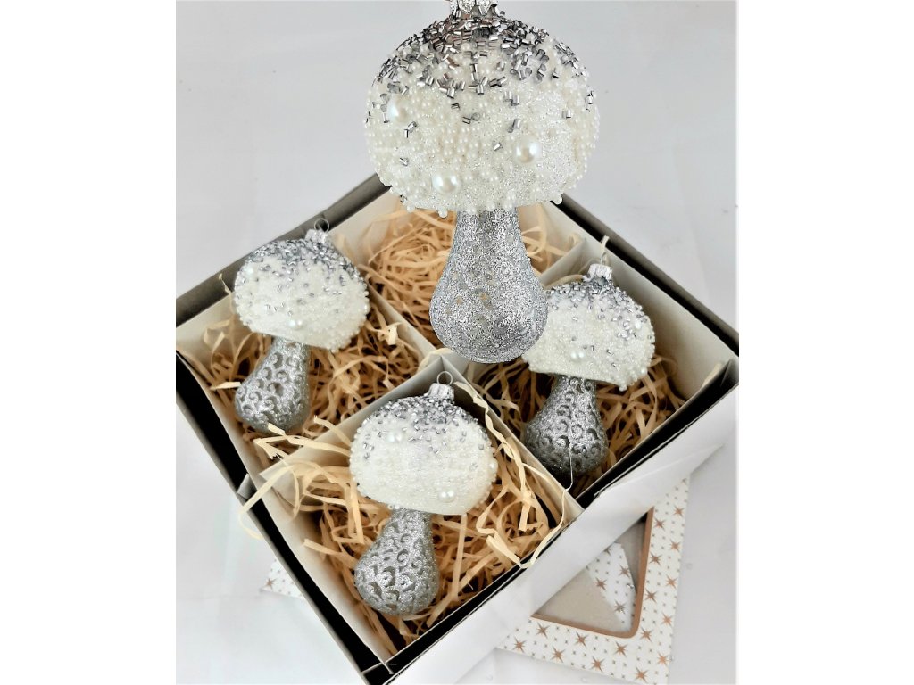 Luxusná kolekcia štyroch vianočných ozdôb v tvare húb spája tradičný tvar s modernou eleganciou. Klobúčiky sú pokryté bielymi perlami, striebornými glitrami a korálkami, ktoré sa na svetle nádherne trblietajú.