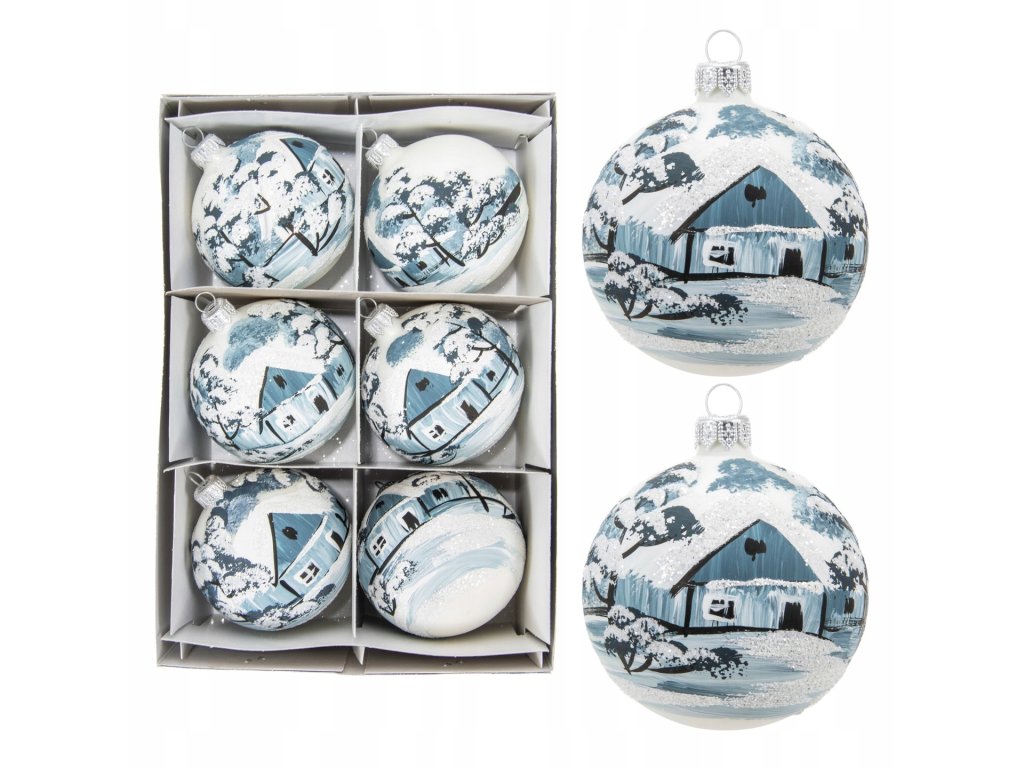Ručne maľované sklenené vianočné gule – zimné domčeky v bielomodrom prevedení (6 ks, Ø 8 cm)