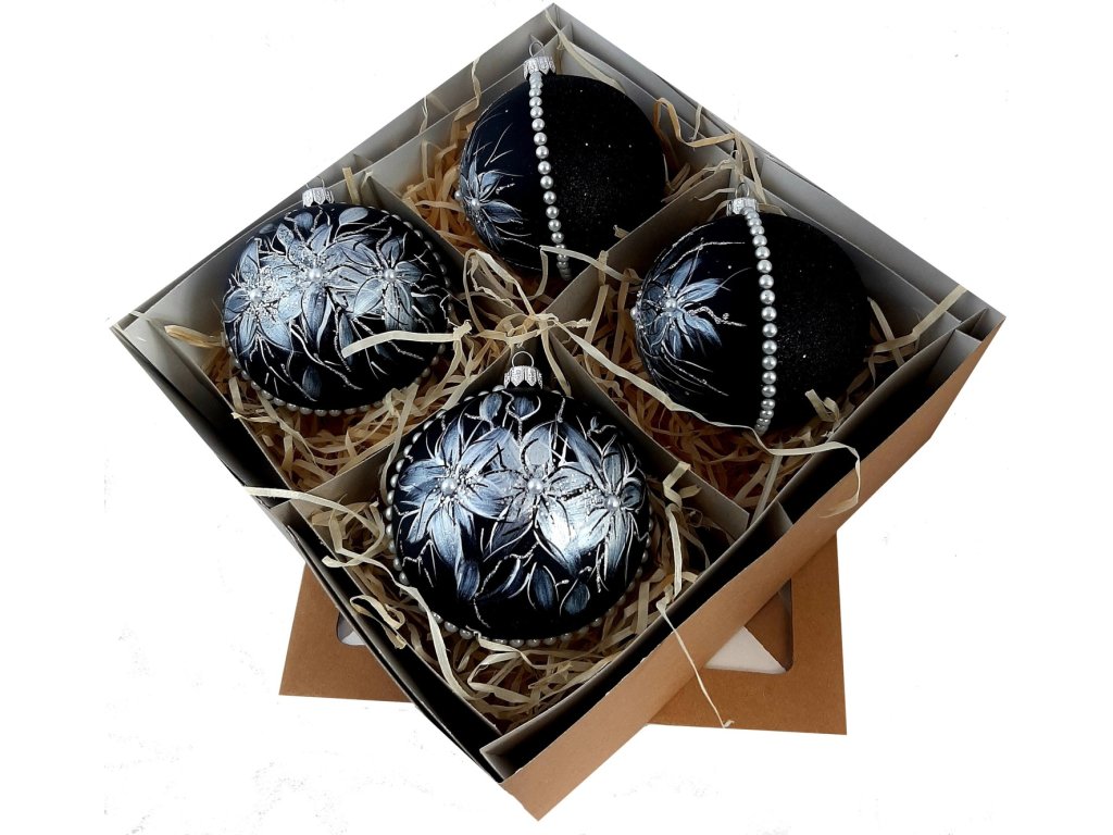 Luxusné ručne zdobené sklenené vianočné gule – čierny set so striebornými kvetmi a perlami (4 ks, Ø 10 cm)