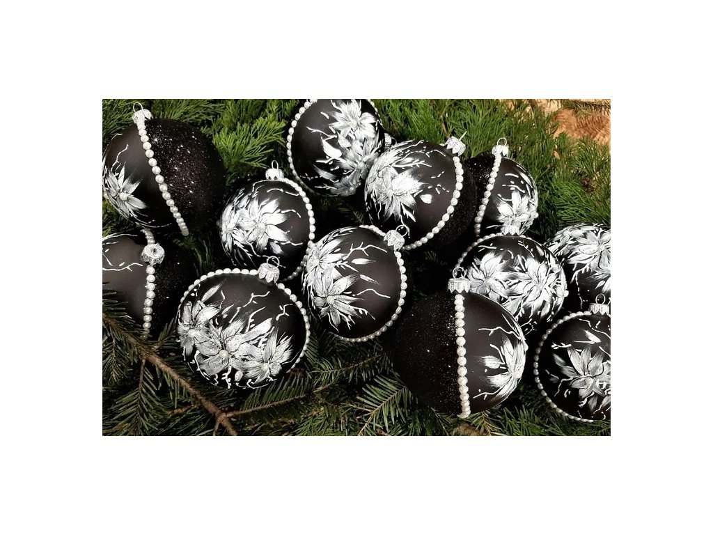 Tento prémiový set spája kontrast čierneho skla a žiarivého striebra v dokonalej harmónii. Každá guľa je ručne fúkaná, maľovaná a dekorovaná jemnými striebornými kvetmi s precíznymi detailmi. Polovica ozdôb je doplnená perlovou líniou, ktorá ich opticky rozdeľuje a dodáva výnimočný noblesný vzhľad.