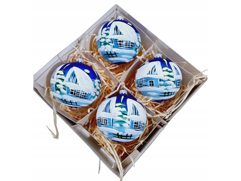 Nádherný set štyroch sklenených vianočných gulí s klasickým motívom zimnej krajinky. Každá guľa je ručne maľovaná – jemné ťahy štetca vytvárajú realistický obraz zasnežených chalúp, bielych stromov a tichého zimného večera. Modrý podklad symbolizuje hlboké nebo, ktoré kontrastuje so snehovým leskom a bielymi detailmi.