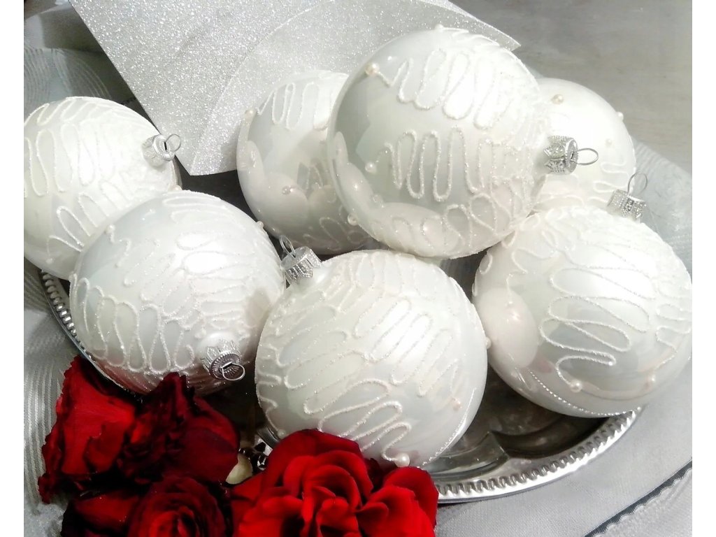 Ručne zdobené biele sklenené gule – elegancia, lesk a jemnosť vo vianočnej podobe 🎄