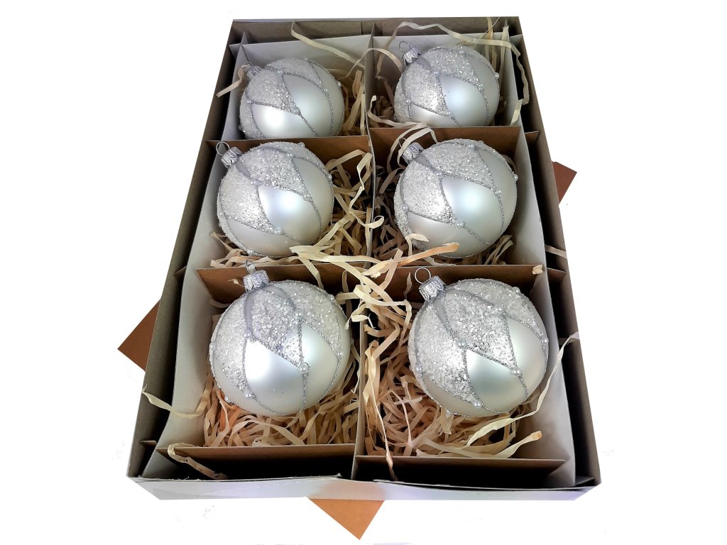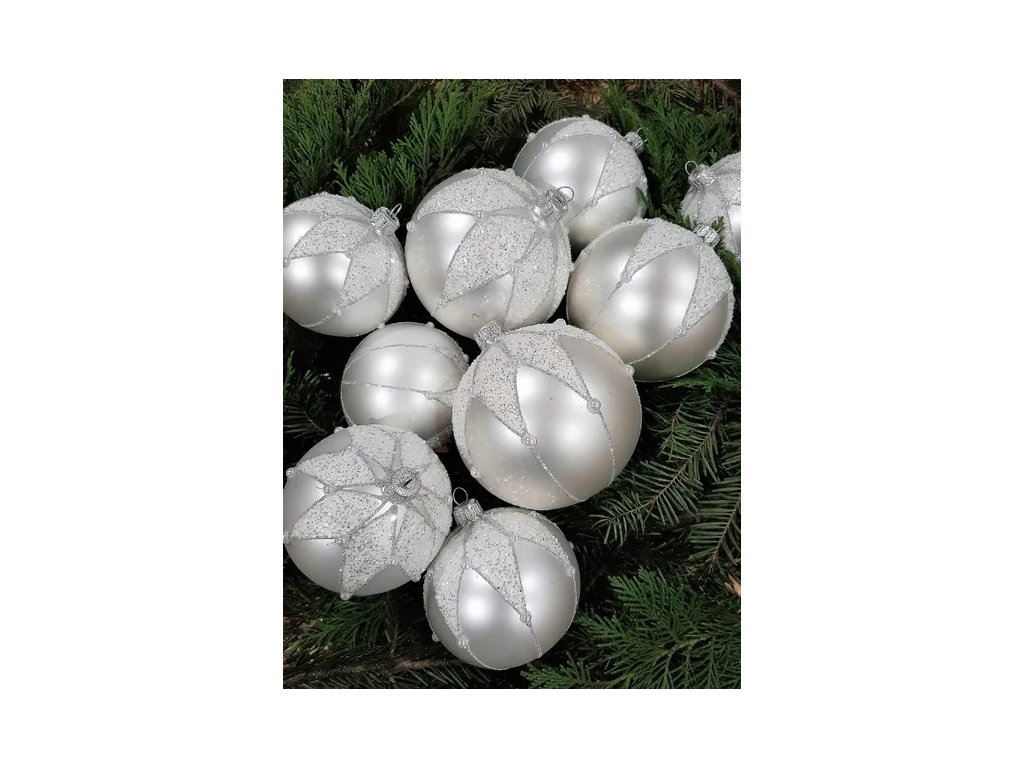 Ručne zdobené sklenené vianočné gule – strieborné s trblietavým vzorom a perleťovým efektom (6 ks, Ø 8 cm)