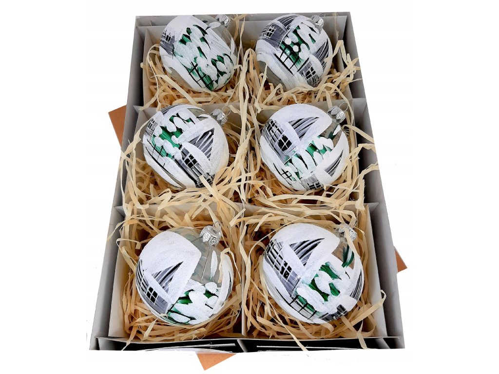 Komplet šiestich ručných sklenených gulí s maľovanou zimnou scenériou – zasnežené chalúpky, tiché stromy a jemné trblietky snehu. Každý motív je maľovaný ručne, preto sa každá guľa stáva jedinečným kúskom, ktorý vnesie do vášho domova nostalgiu starých čias.