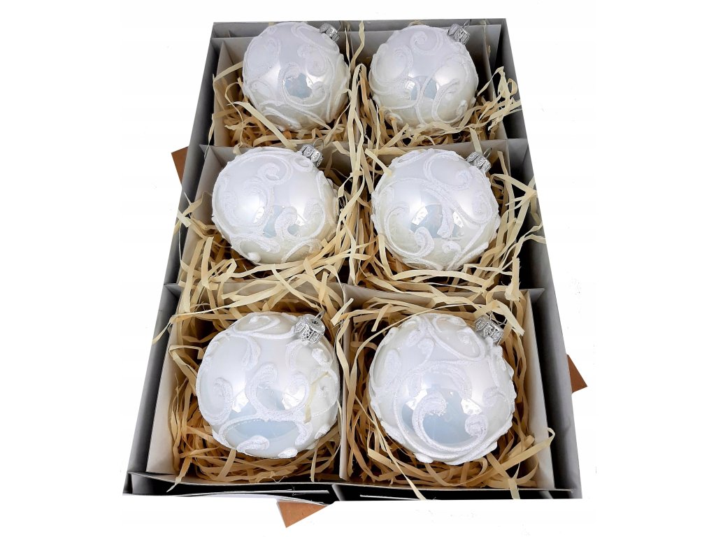 Ručne zdobené sklenené vianočné gule – biele s opálovým leskom a ornamentom (6 ks, Ø 8 cm)