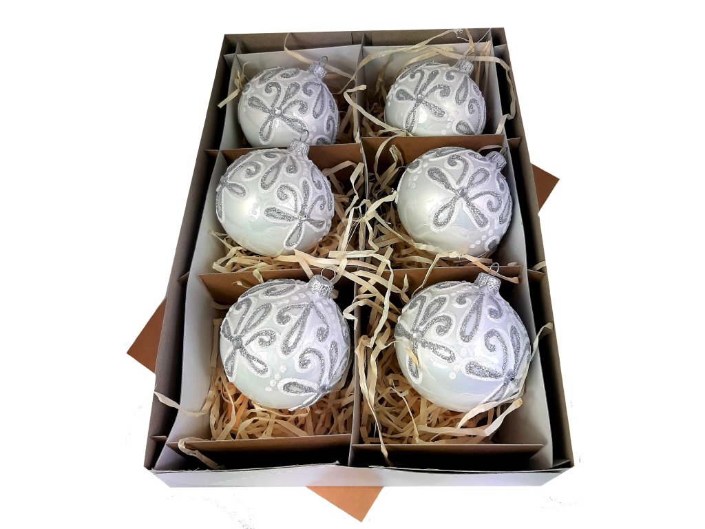 Elegantná súprava šiestich sklenených gulí prináša do vášho domova sviatočný lesk a noblesu. Každý kus je ručnou prácou – pokrytý jemným strieborným ornamentom, ktorý vytvára nádherný kontrast k bielemu základnému tónu.