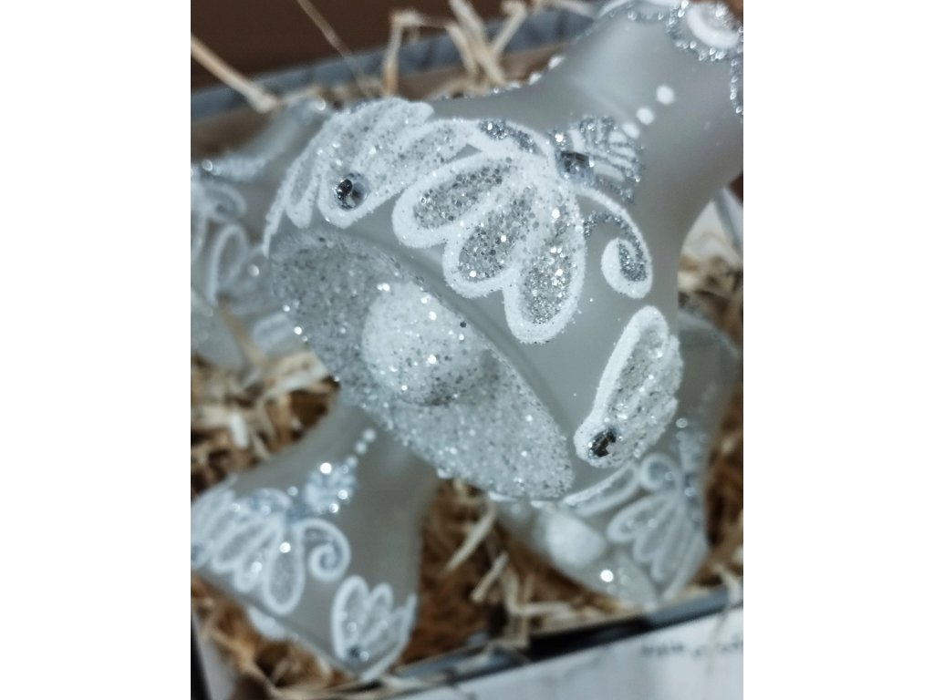 Ručne zdobené sklenené vianočné zvončeky – bielo-strieborné s trblietavým ornamentom (4 ks, výška 10 cm)