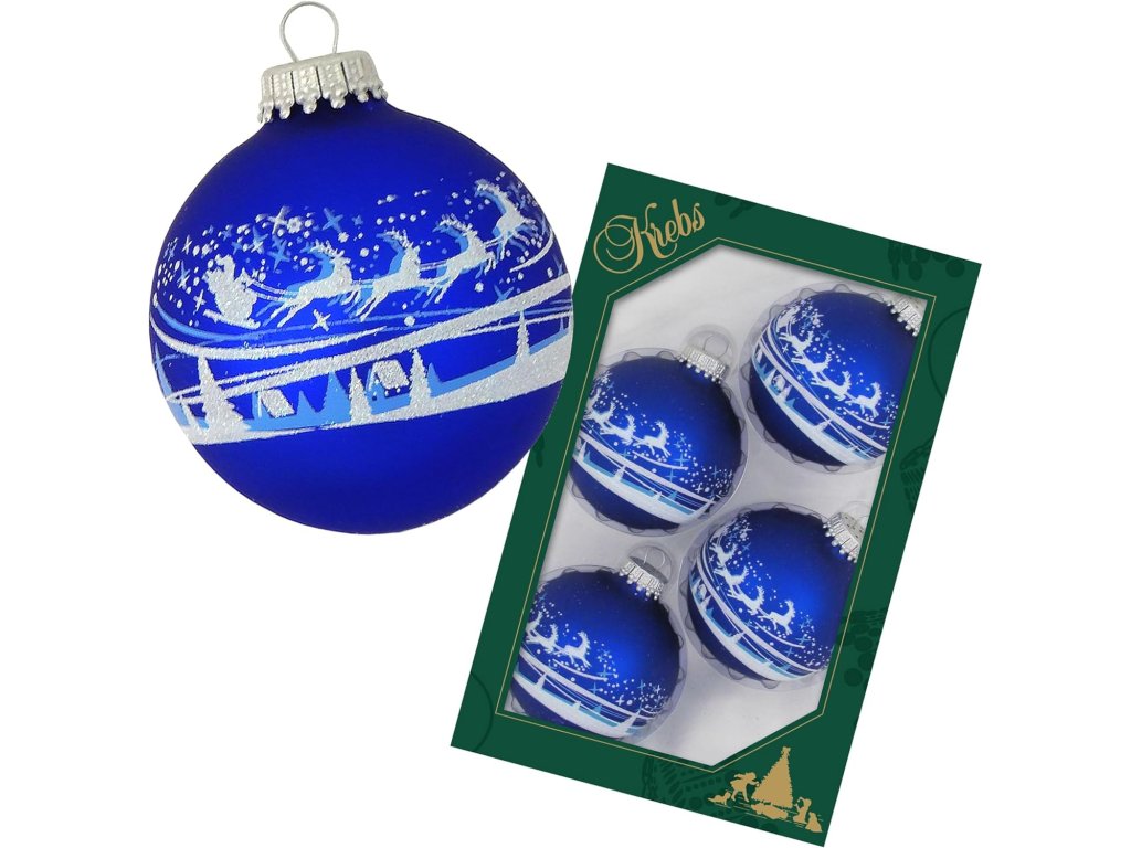 Táto elegantná sada štyroch ručných sklenených gulí v kráľovsky modrej farbe prinesie do vášho interiéru dotyk zimnej noci. Na každej guli je zobrazený Santa Claus v saniach so sobím záprahom, prelietajúci ponad zasnežené mesto. Strieborné glitre a kontrastný modrý podklad vytvárajú efekt žiarivej zimnej oblohy.