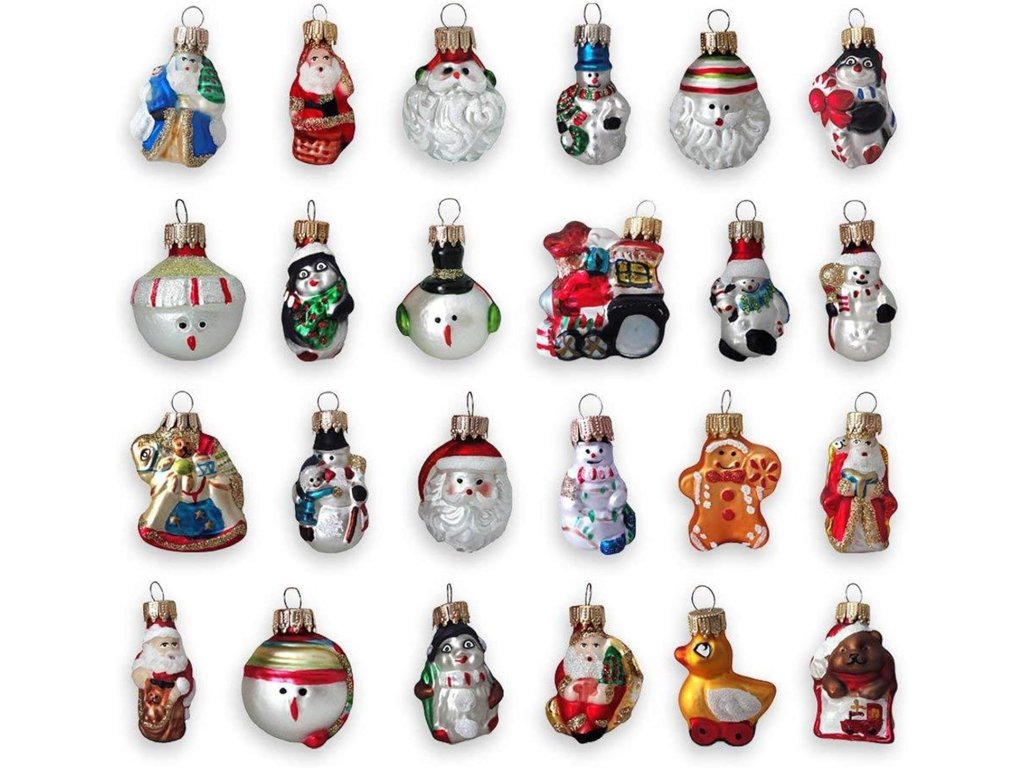 Objavte kúzlo tradičných sklenených vianočných ozdôb v miniatúrnom prevedení. Táto jedinečná sada obsahuje 24 drobných ručne zdobených figúrok, ktoré zachytávajú najobľúbenejšie sviatočné motívy – Santu, snehuliakov, anjelov, medvedíkov, perníkových panáčikov či vláčik. Každá ozdoba je malým umeleckým dielom s bohatými detailmi a trblietavými akcentmi.