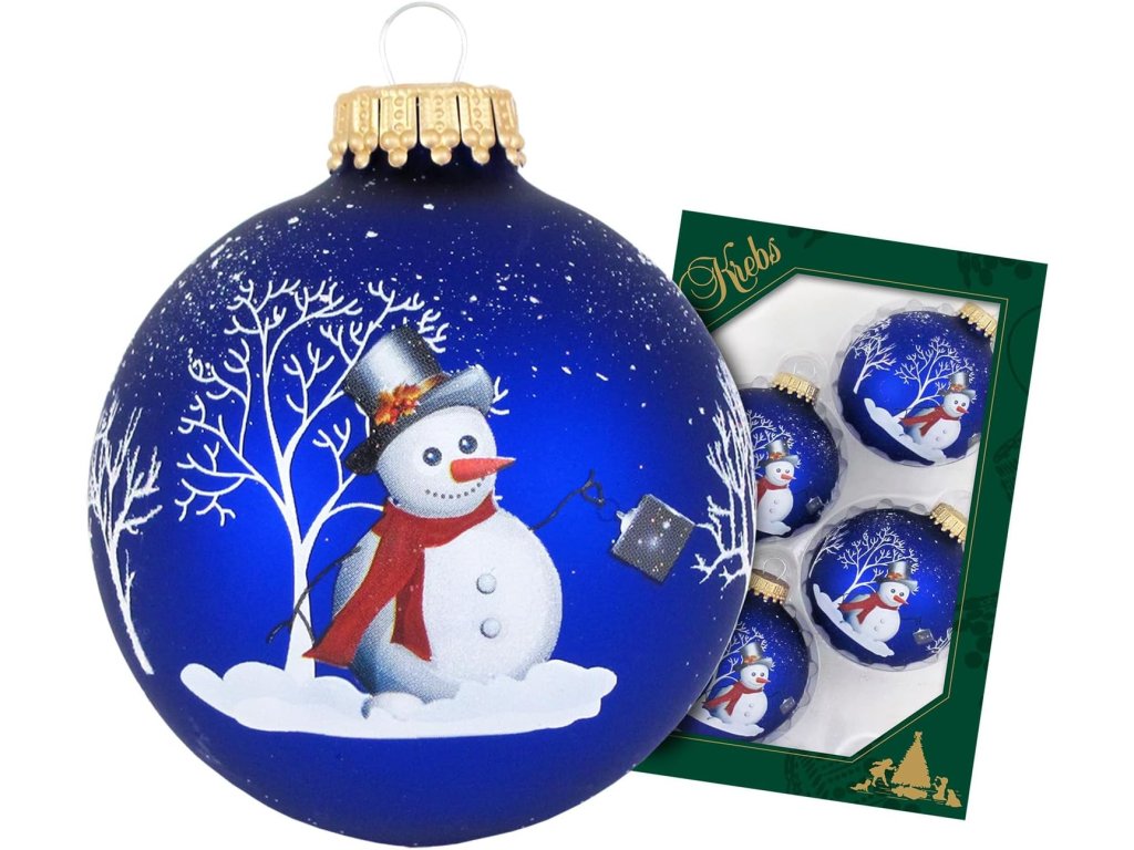 Ručne maľované sklenené vianočné gule – modré s veselým snehuliakom (4 ks, Ø 7 cm)