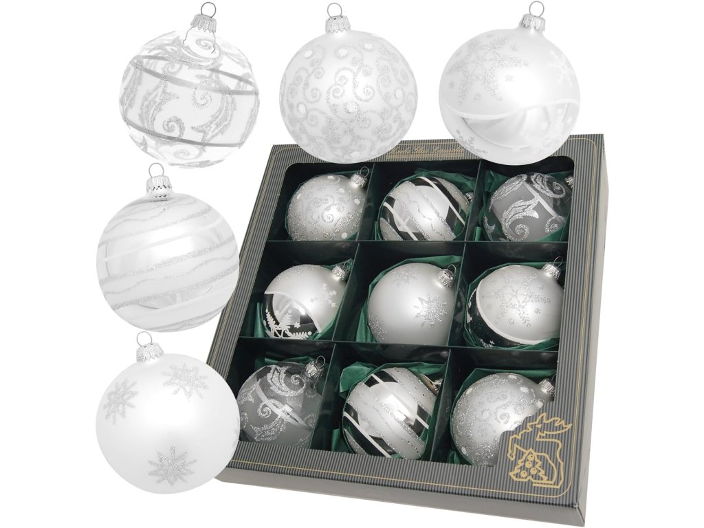 Táto nádherná súprava 9 sklenených vianočných ozdôb v bielom a striebornom prevedení vnesie do vašej výzdoby harmóniu, svetlo a pokoj Vianoc. Každá guľa je ručne zdobená trblietavými detailmi – motívmi hviezd, vločiek, ornamentov a špirál, ktoré sa nádherne lesknú pri svetle stromčekových reťazí.