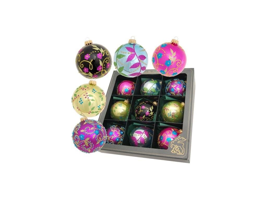 Ručne zdobené sklenené vianočné gule – farebná kolekcia Magic Forest (9 ks, Ø 8 cm)