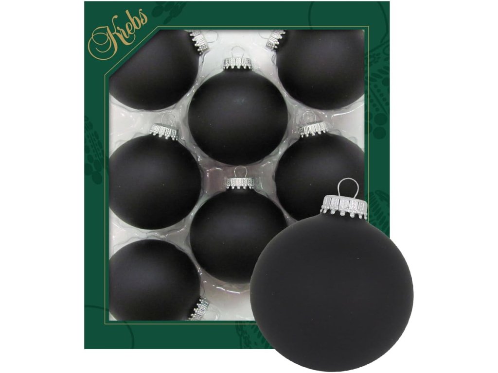 Sada ôsmich sklenených ozdôb v hlbokej čiernej farbe prináša na Vianoce štýl, minimalizmus a sofistikovanosť. Matný povrch krásne pohlcuje svetlo, čím vytvára jemný luxusný dojem v každej sviatočnej výzdobe.