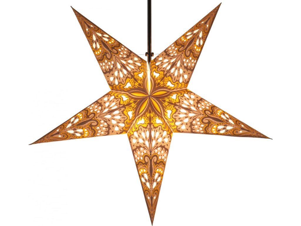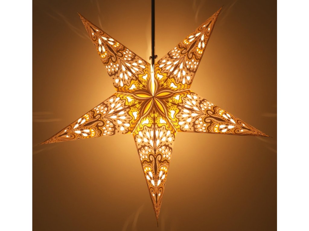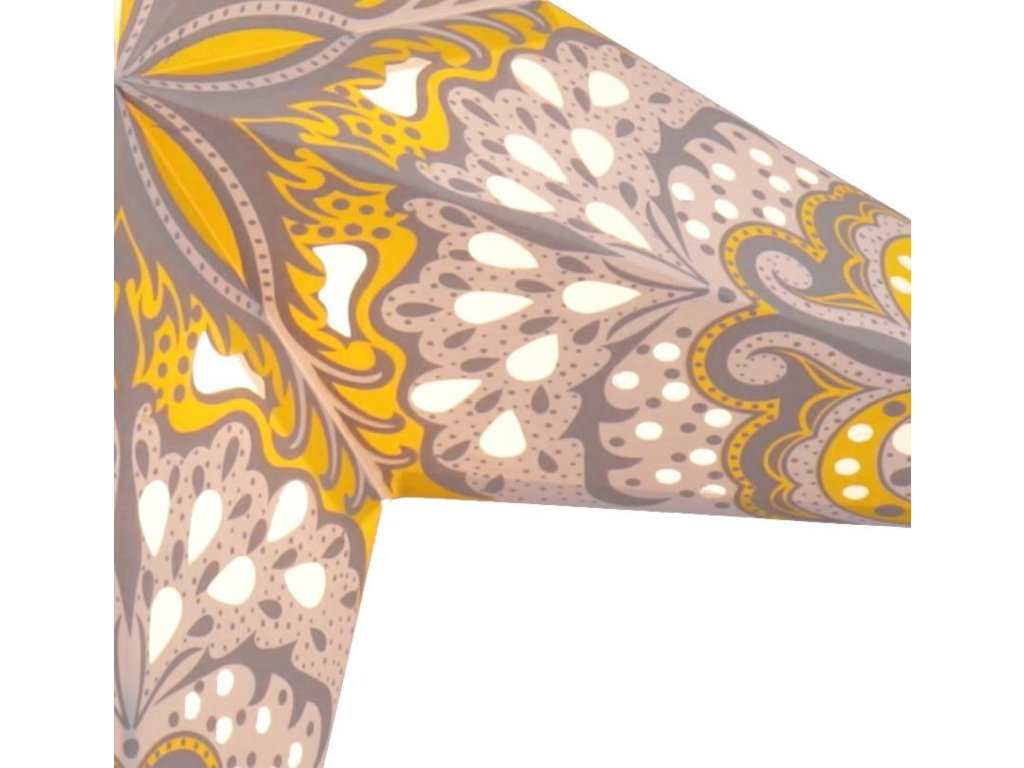 Táto papierová vianočná hviezda kombinuje prírodný podklad so žltým vitrážnym vzorom, ktorý vynikne najmä po rozsvietení. Vytvára hrejivý efekt, ktorý premení každý interiér na útulný sviatočný priestor. Aj cez deň pôsobí dekoratívne vďaka svojej detailnej kresbe.