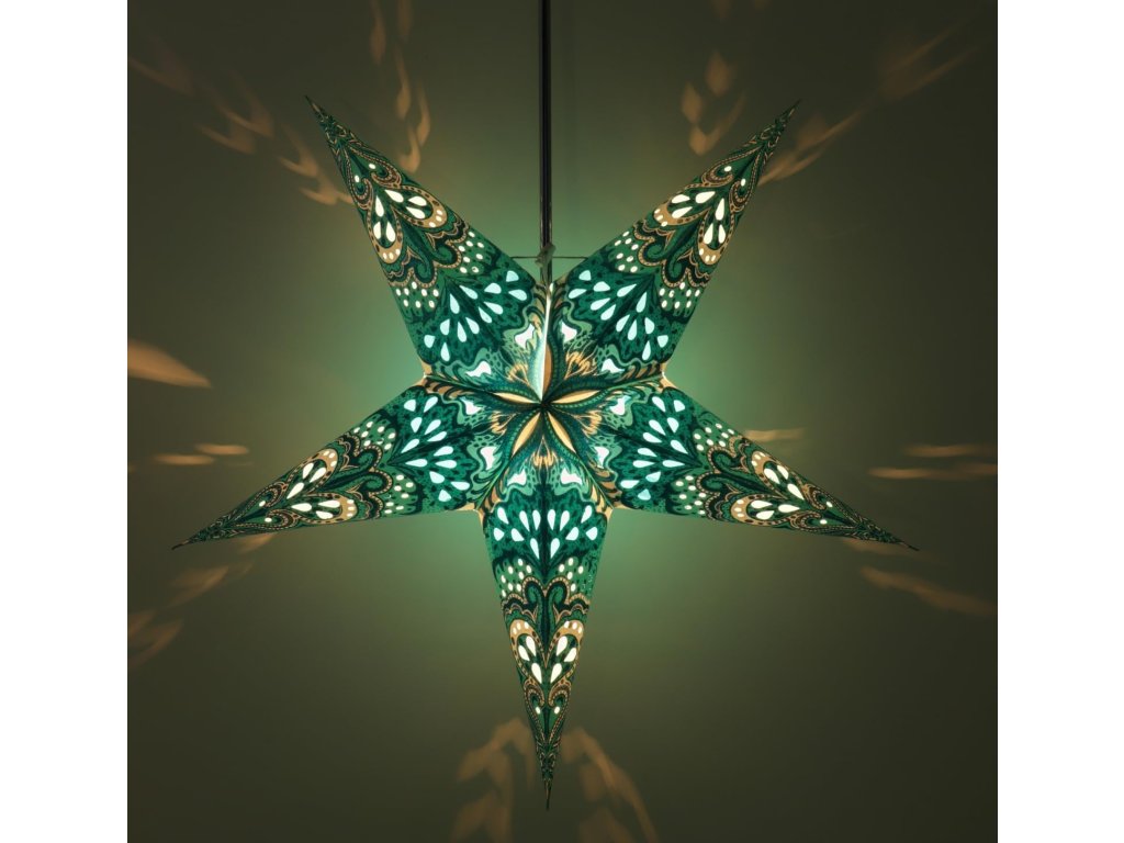 Elegantná papierová vianočná hviezda s tyrkysovo-zeleným vitrážnym vzorom prinesie do vášho domova teplé, atmosférické svetlo. V okne či zavesená v interiéri vytvorí efekt vitráže – jemne presvitá a kreslí na stenu dekoratívne odlesky. Aj bez osvetlenia pôsobí ako prémiová dekorácia.