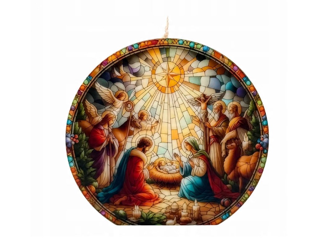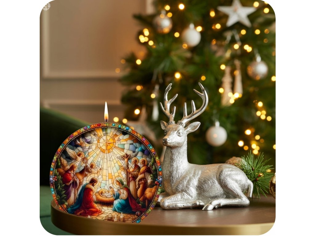 Táto luxusná vianočná sviečka prináša ikonickú scénu narodenia Ježiša – Svätú rodinu obklopenú anjelmi, pastiermi a žiarou betlehemskej hviezdy. Motív je spracovaný ako vitráž s jemnými tónmi a detailmi, ktoré pri svetle plameňa pôsobia mimoriadne pôsobivo a slávnostne.