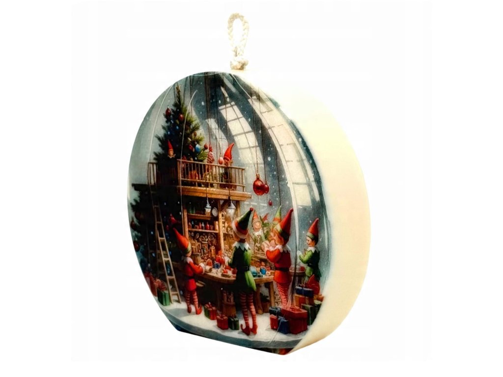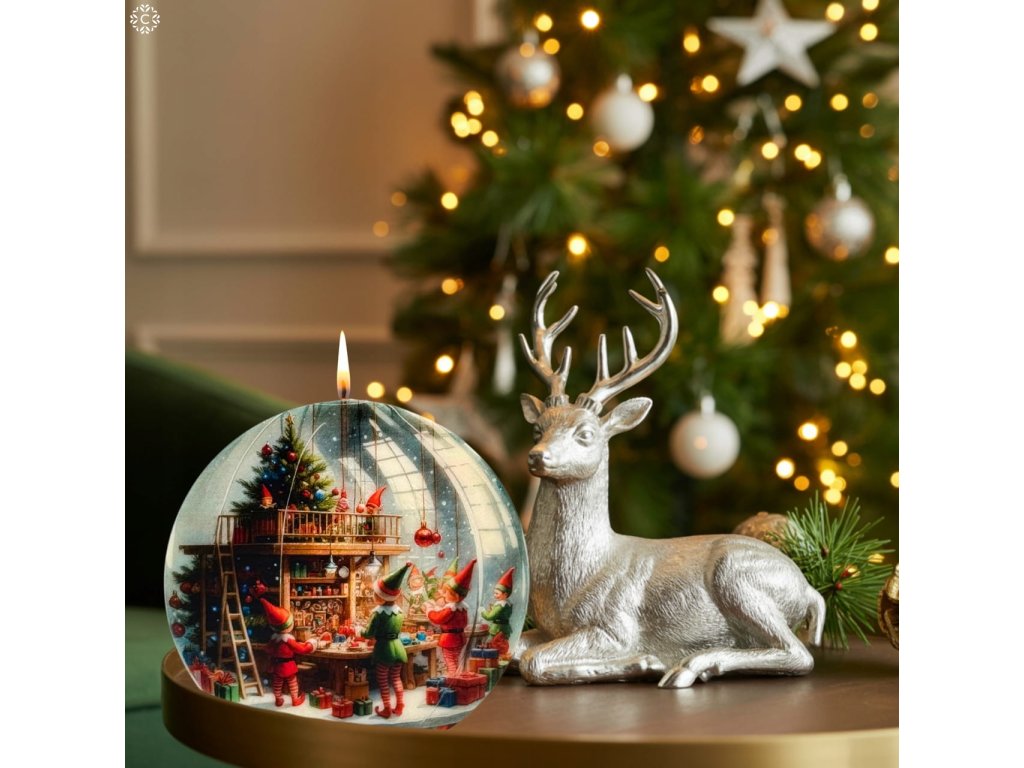 Táto luxusná vianočná sviečka prináša jedinečný motív elfov pracujúcich v dielni Santa Clausa. Malí pomocníci, darčeky, žiariaci stromček a sviatočné detaily vytvárajú čarovnú atmosféru, ktorá pri zapálení plameňa ožije v plnej kráse.