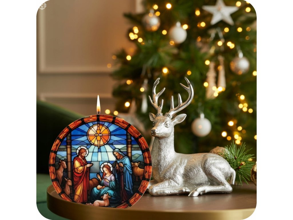 Táto luxusná vianočná sviečka prináša nezameniteľný motív Svätej rodiny vyobrazený v podobe gotickej vitráže. Bohaté farby, jemné detaily a sakrálny charakter vytvárajú umelecké dielo s duchovným posolstvom, ktoré sa stane ozdobou vášho sviatočného interiéru.