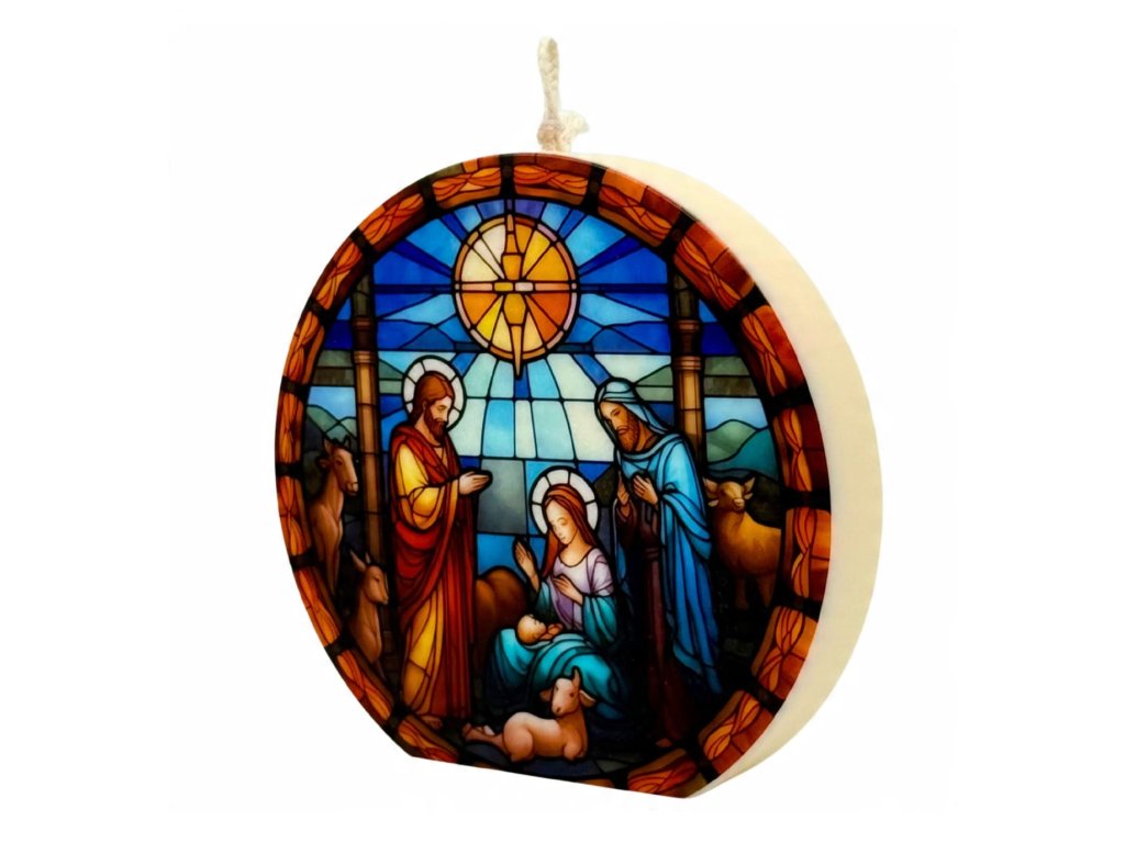Vianočná luxusná sójová sviečka – Svätá rodina v gotickom vitráži 15 cm
