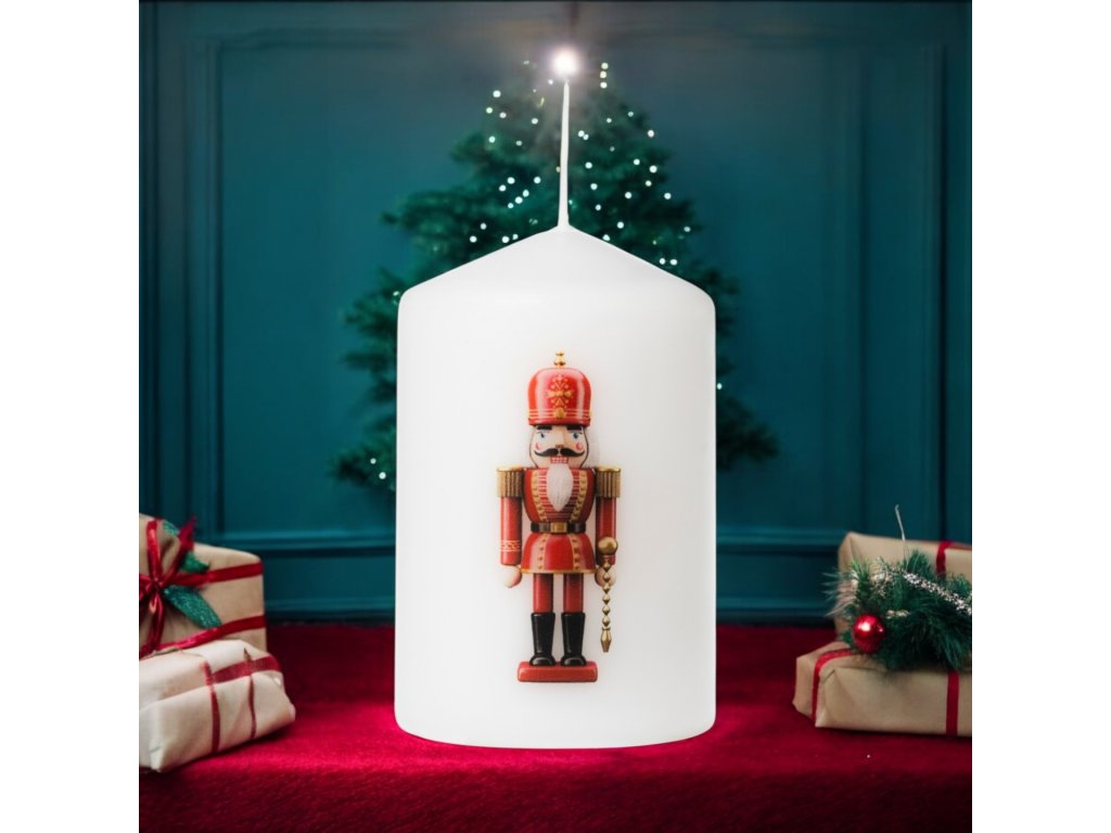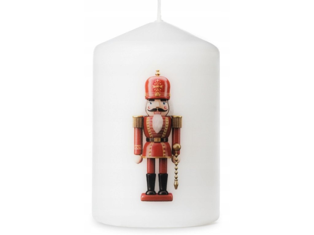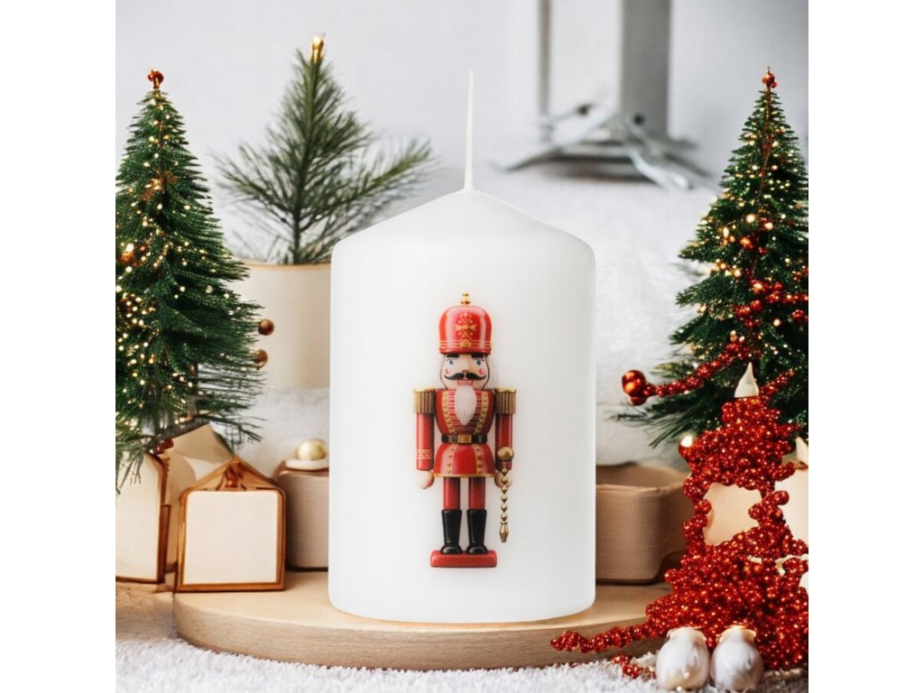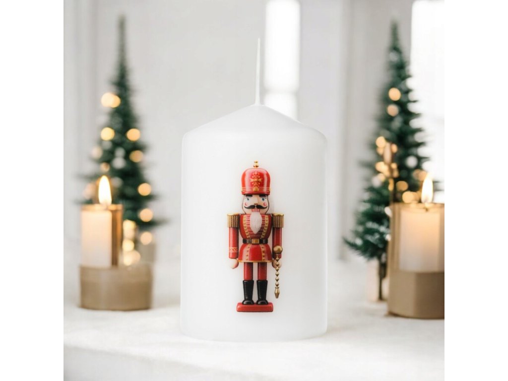 Vianočná valcová sviečka – Luskáčik ako symbol sviatočnej tradície 8 cm