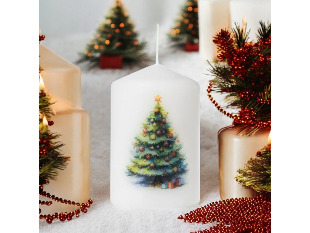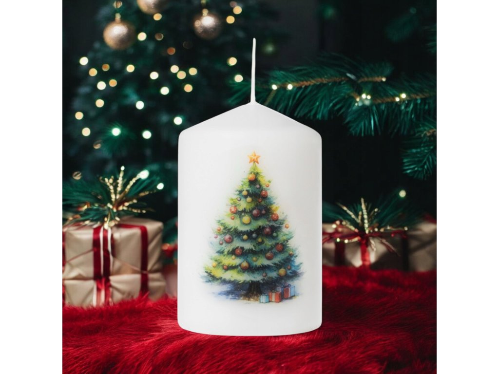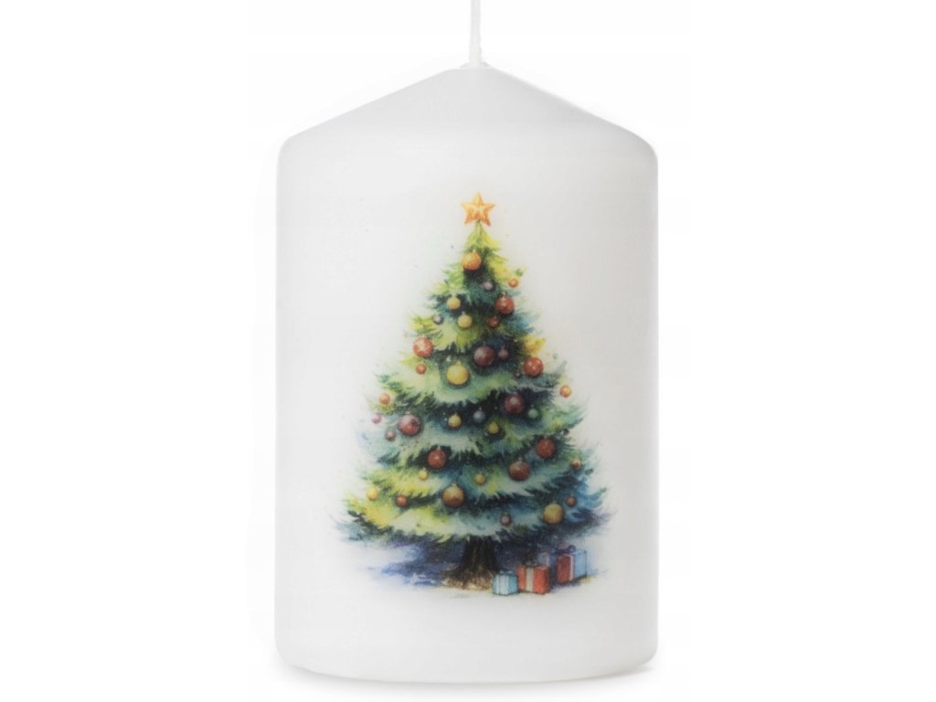 Táto vianočná valcová sviečka s motívom zdobeného stromčeka a darčekov prinesie do vášho interiéru teplo, tradíciu a sviatočné čaro. Vianočný stromček je odvekým symbolom radosti a rodinnej pohody, a preto sa sviečka hodí do každej sviatočnej výzdoby – od klasickej po modernú.