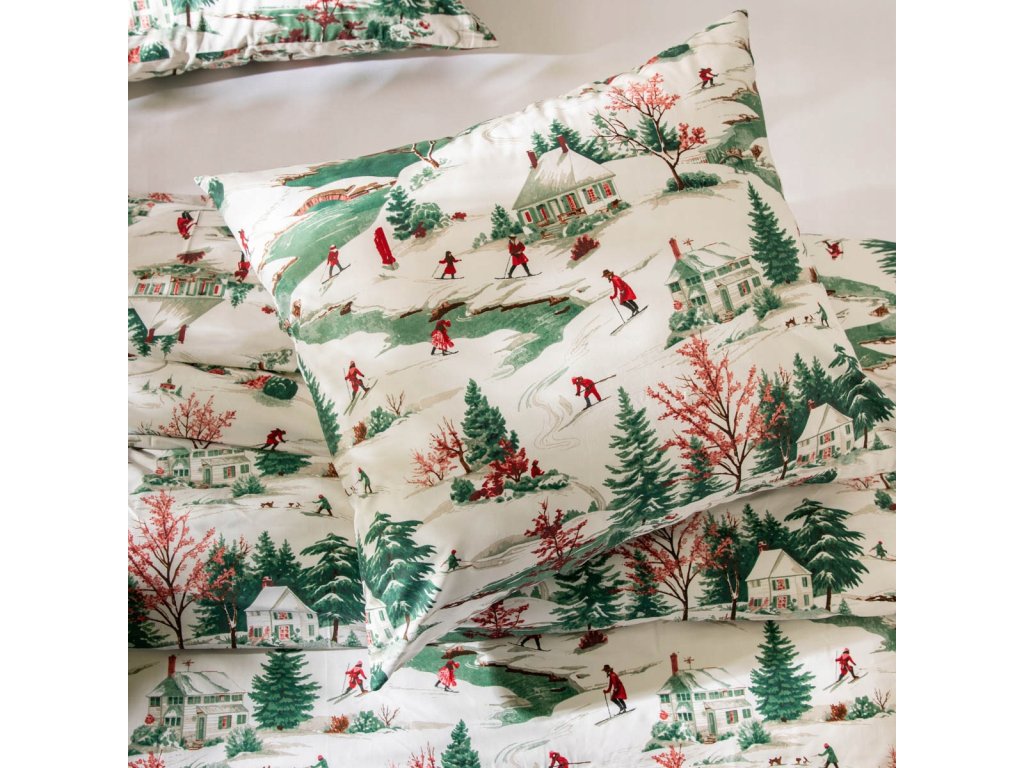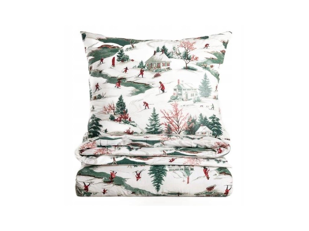Tieto vianočné obliečky z kvalitnej bavlny vás prenesú do malebnej zimnej dedinky, kde sa medzi stromami preháňajú lyžiari a všetko pokrýva biely sneh. Motív v štýle retro ilustrácií vytvára čarovnú atmosféru, ktorá poteší milovníkov klasických Vianoc aj hôr.