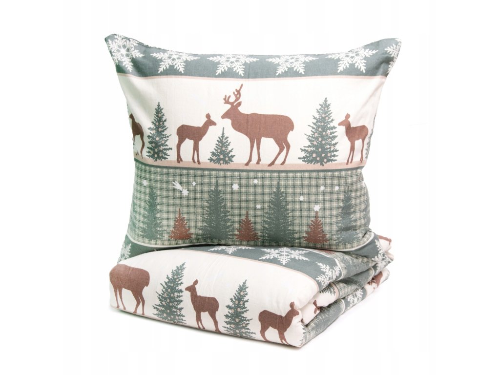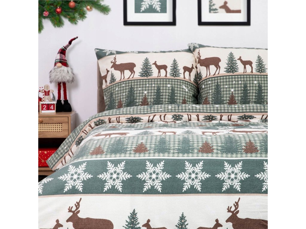 Vianočné flanelové obliečky – béžovo-zelená posteľná bielizeň s motívom jeleňov a vločiek
