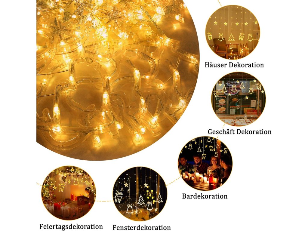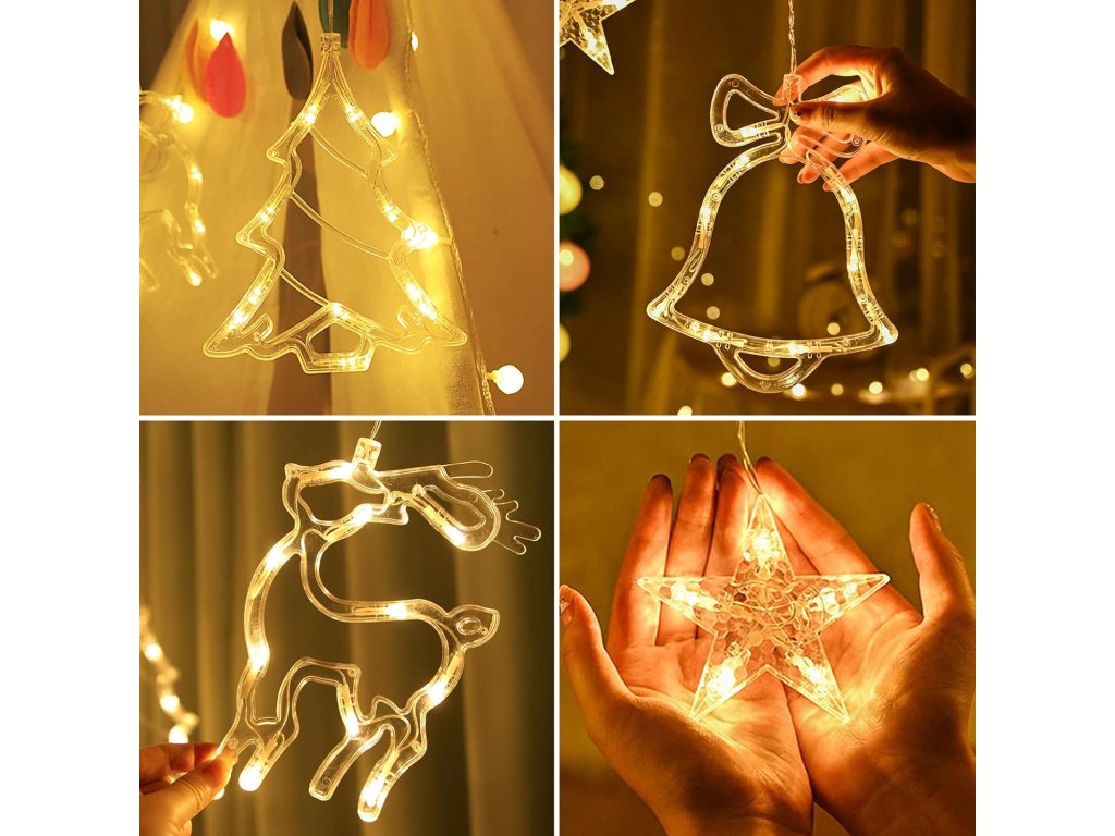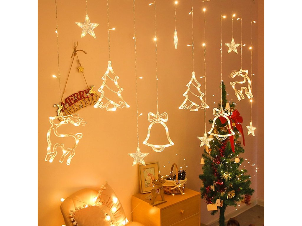 LED vianočný svetelný záves – 138 LED, 8 režimov, teplá biela dekorácia s motívmi hviezd, stromčekov, zvončekov a sobíkov