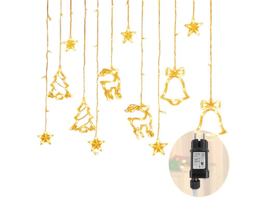 LED vianočný svetelný záves – 138 LED, 8 režimov, hviezdy, stromčeky, sobíky a zvončeky, teplá biela – IP44
