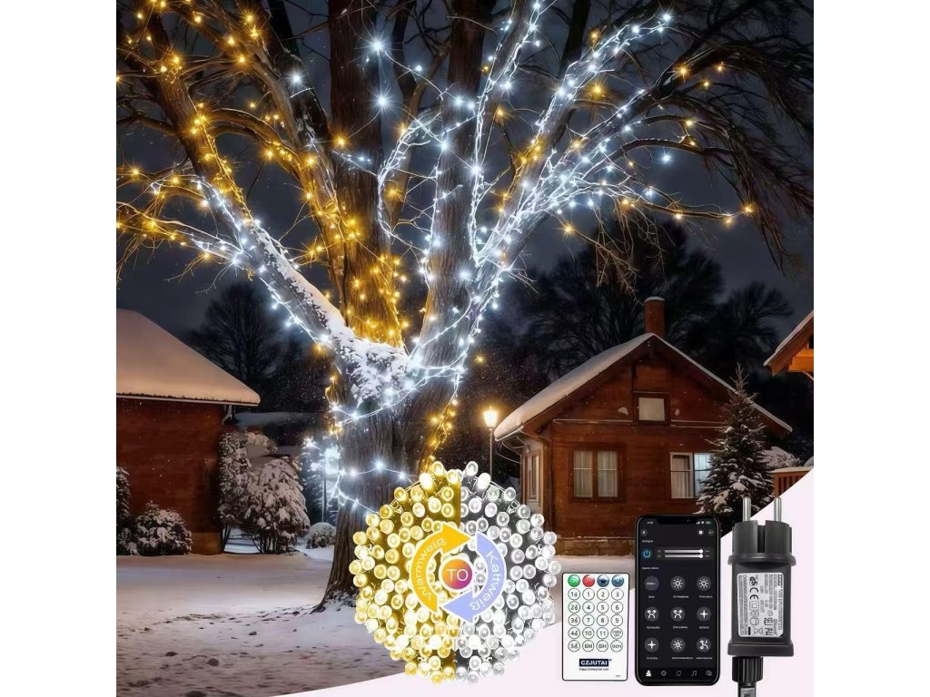 Táto moderná smart LED svetelná reťaz kombinuje krásny efekt teplej bielej a studenej bielej. Pomocou mobilnej aplikácie získate prístup k 17 svetelným režimom, rôznym efektom, úprave jasu a možnosti vytvoriť presne takú atmosféru, akú si želáte – od jemného zimného trblietania až po slávnostné vianočné osvetlenie.