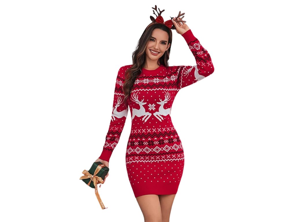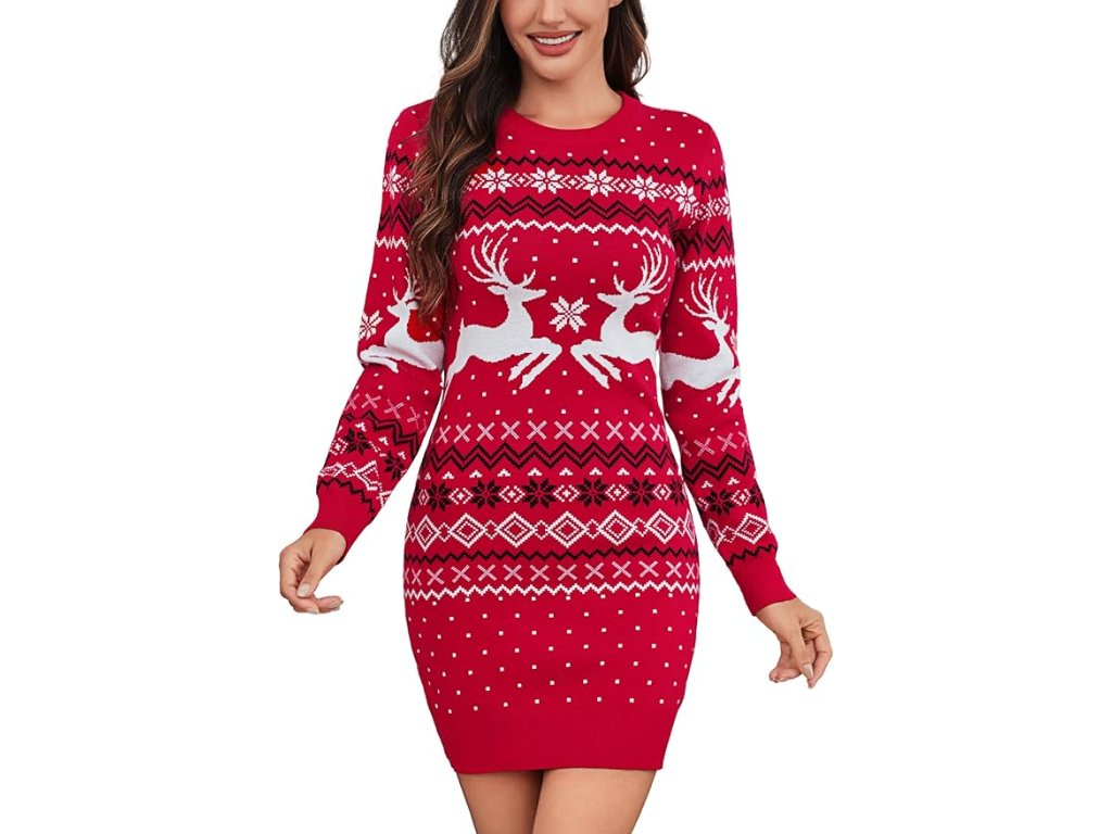 Dámske vianočné pletené šaty – červená zimná mikulášska tunika so sobím vzorom a vločkami