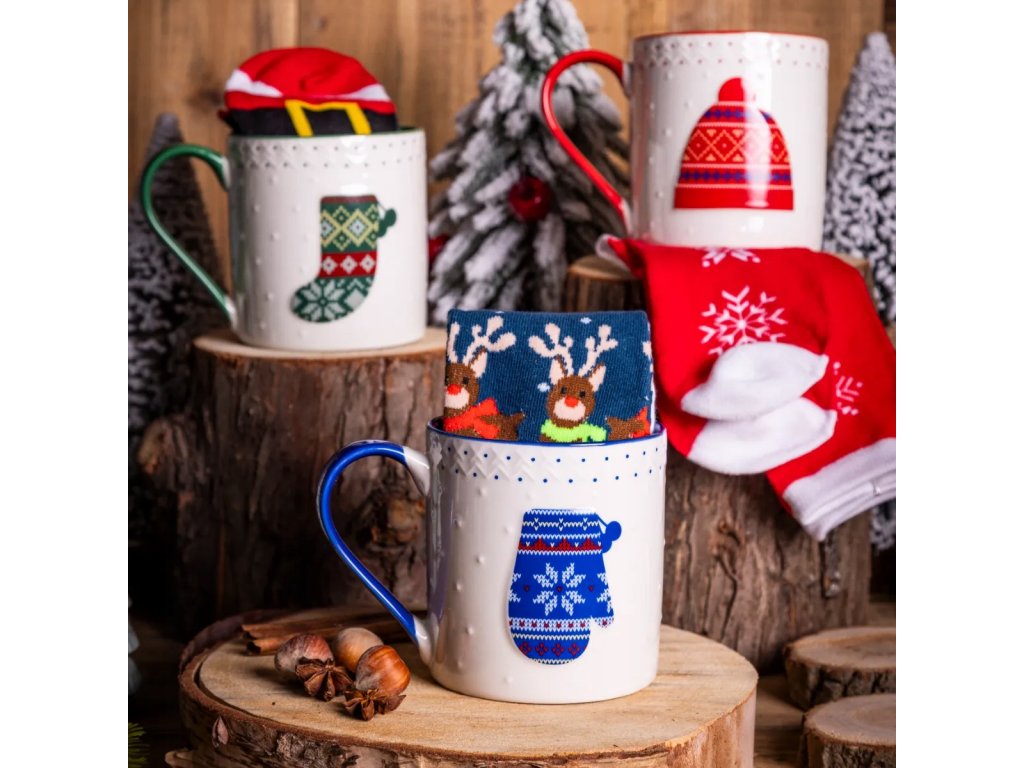 - Farby & motívy: biely hrnček, rukavica a vločky; ponožky so sobíkmi