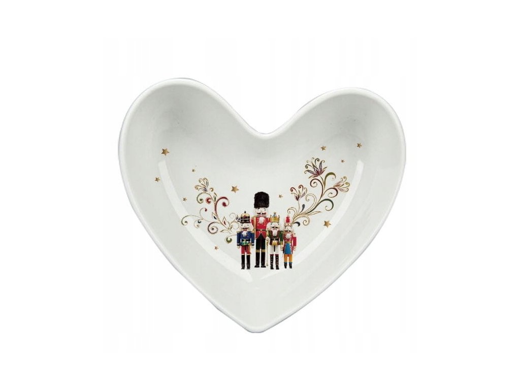 Nechajte sa očariť kúzlom sviatkov s porcelánovou miskou v tvare srdca z kolekcie Luskáčik. Jemný porcelán v bielej farbe, zlaté hviezdičky a ornamenty spolu s motívom vianočných vojačikov vytvárajú elegantnú a radostnú kompozíciu.