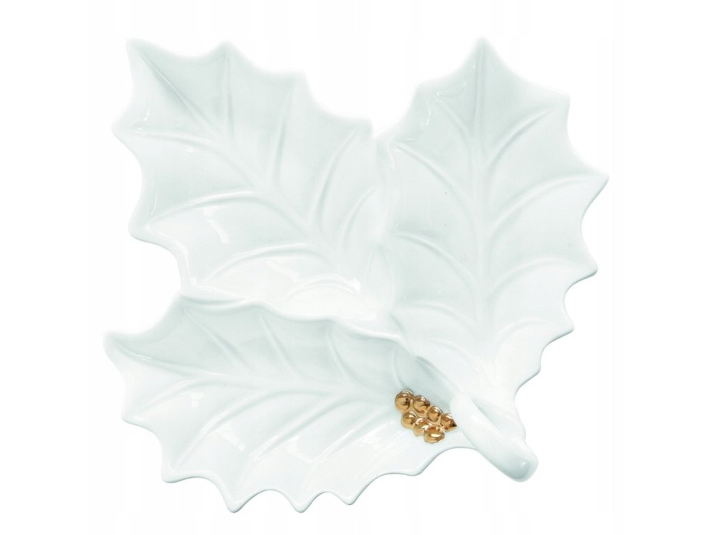 Sviatočný servírovací tanier Zlatá cezmína – porcelánový list s rukoväťou a zlatými bobuľami 22×20 cm