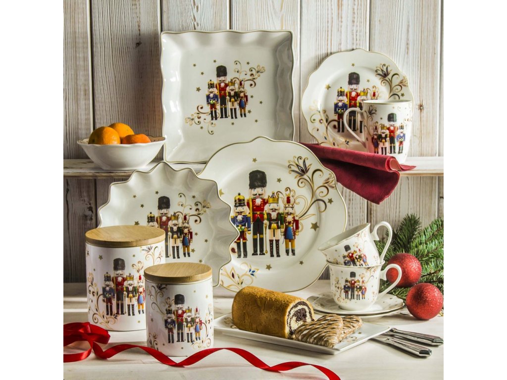 Oživte svoje sviatočné stolovanie s oválnym porcelánovým tanierom z kolekcie Luskáčik. Motív vianočných vojačikov doplnený zlatými ornamentmi a hviezdami vytvára nádherný kontrast na bielom porceláne a navodí atmosféru klasických Vianoc.