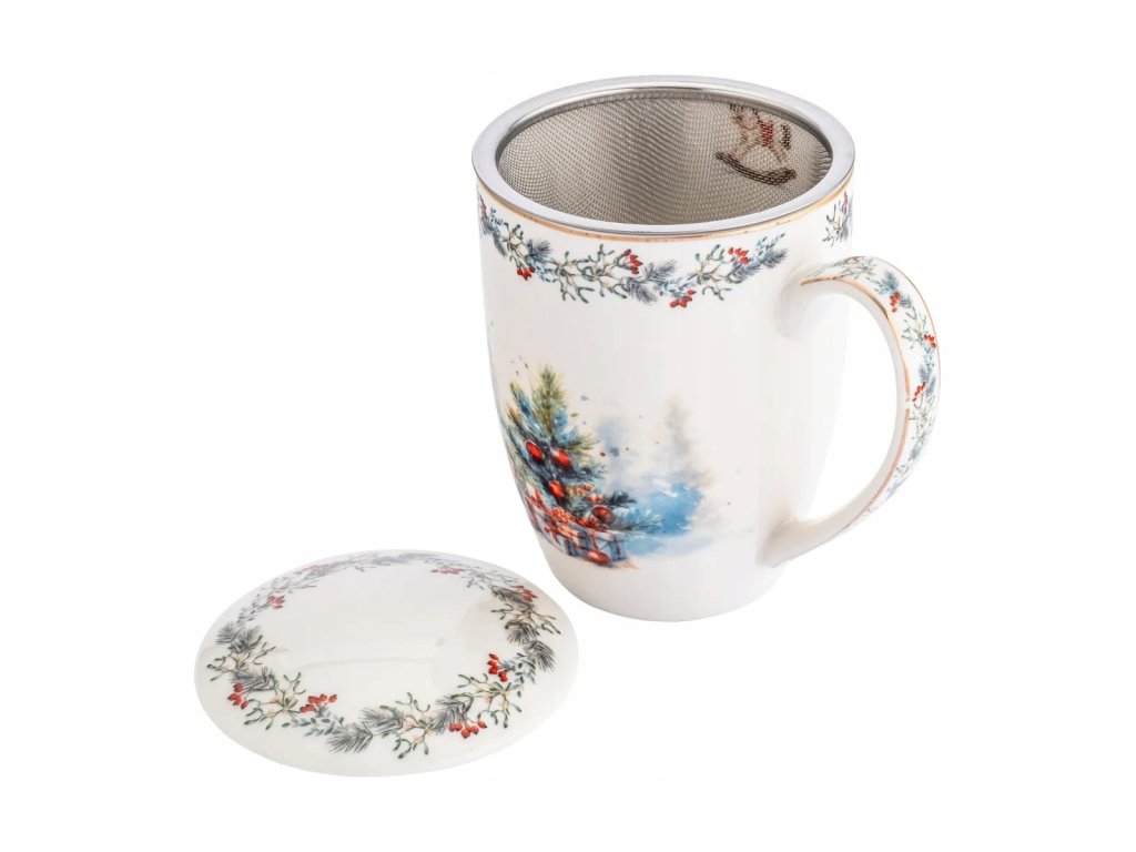 Vianočný hrnček Zimná harmónia – porcelánový hrnček so sitkom a pokrievkou 350 ml