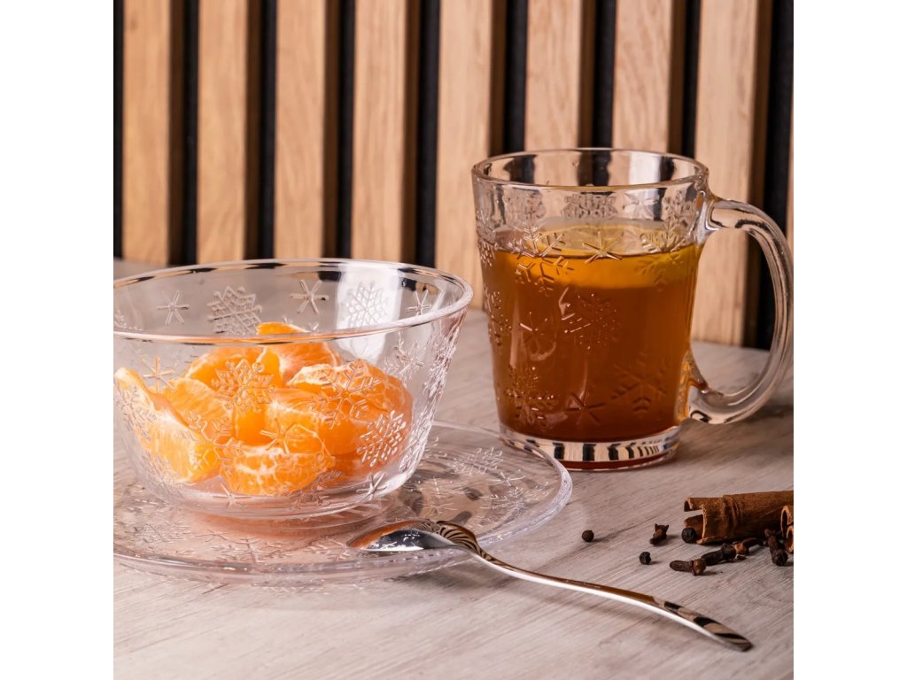 Priehľadný hrnček s reliéfnym vzorom snehových vločiek prinesie do vášho stolovania čarovnú atmosféru. Je ideálny na podávanie čaju, kávy či horúcej čokolády – nech sa z každého dúšku stane malý rituál pohody.