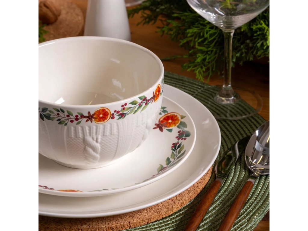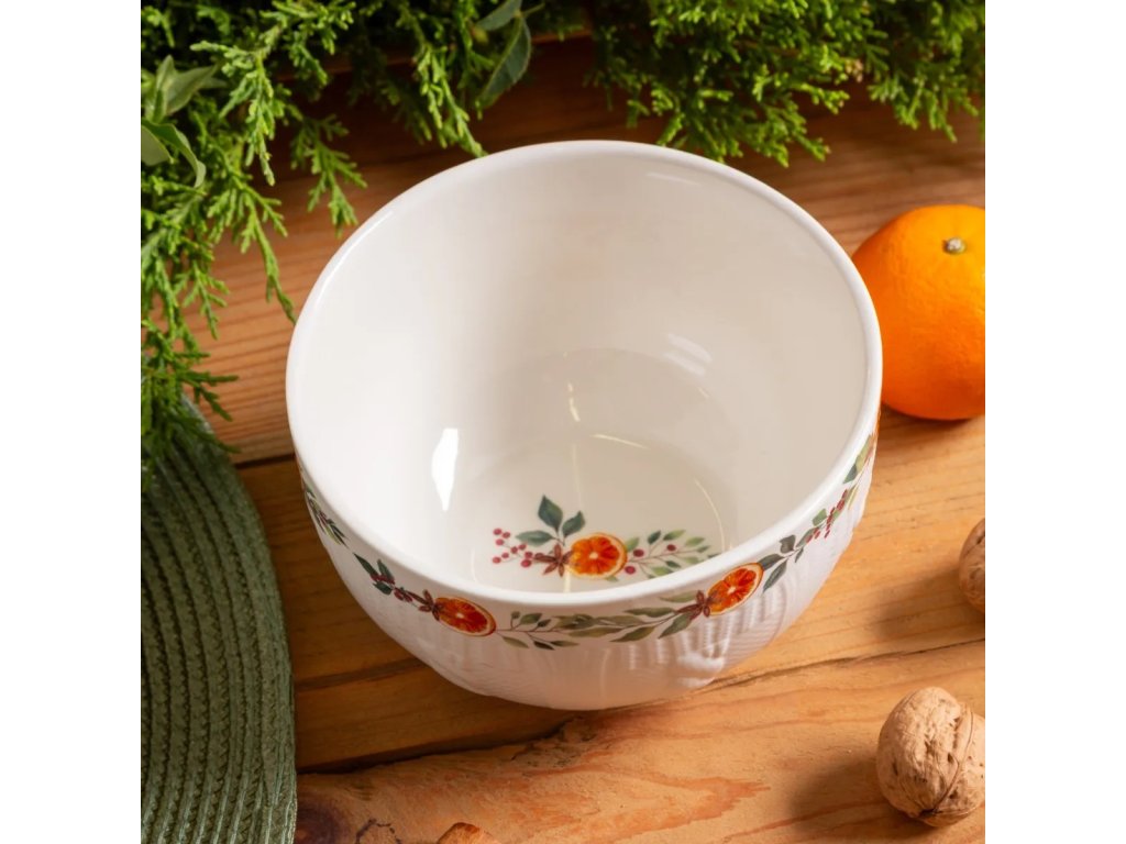 Vneste do svojho stola kúzlo zimných dní s porcelánovou miskou Hrejivá zima. Jej kapacita 780 ml je ideálna na raňajkové müsli, krémovú polievku či sviatočný dezert. Jemné zdobenie s pomarančmi, korením a vetvičkami vytvára teplý a radostný sviatočný dojem.