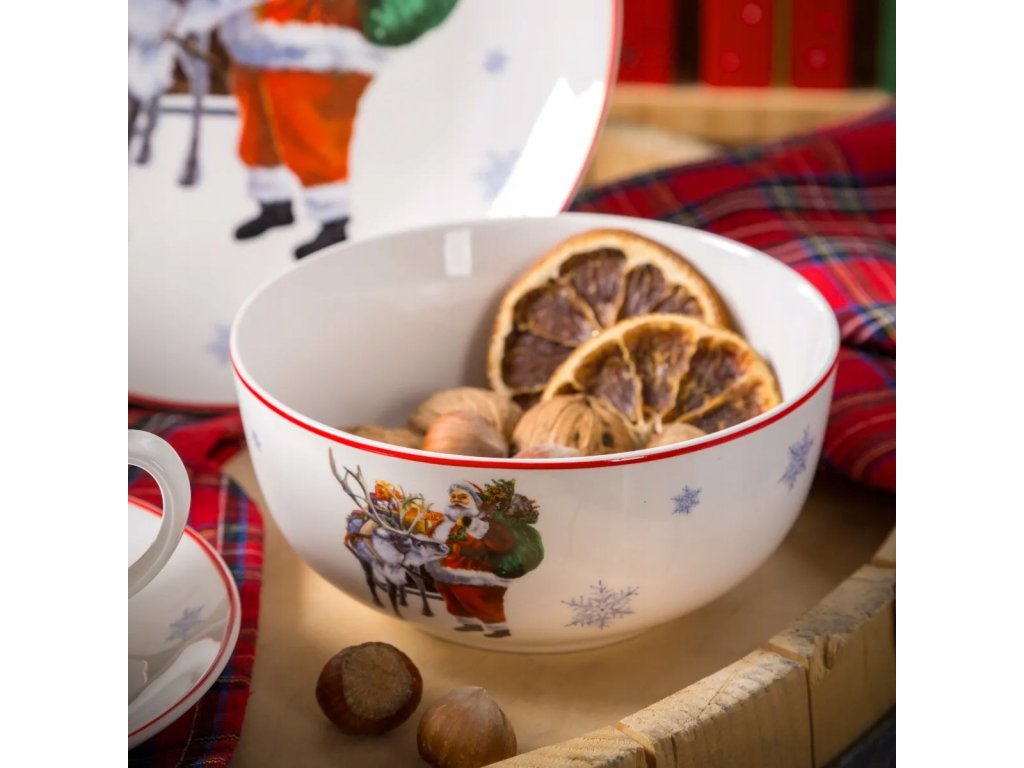 Začnite deň vianočne s porcelánovou miskou Sobí sprievod, ktorá spája tradíciu, kvalitu a rozprávkovú atmosféru. Motív Mikuláša so sobom a plným vrecom darčekov je stvárnený v klasickom štýle, doplnený o jemné snehové vločky a červený lem. Každý detail pripomína radostné chvíle Vianoc a dodá vašim stolovaniam sviatočný nádych.