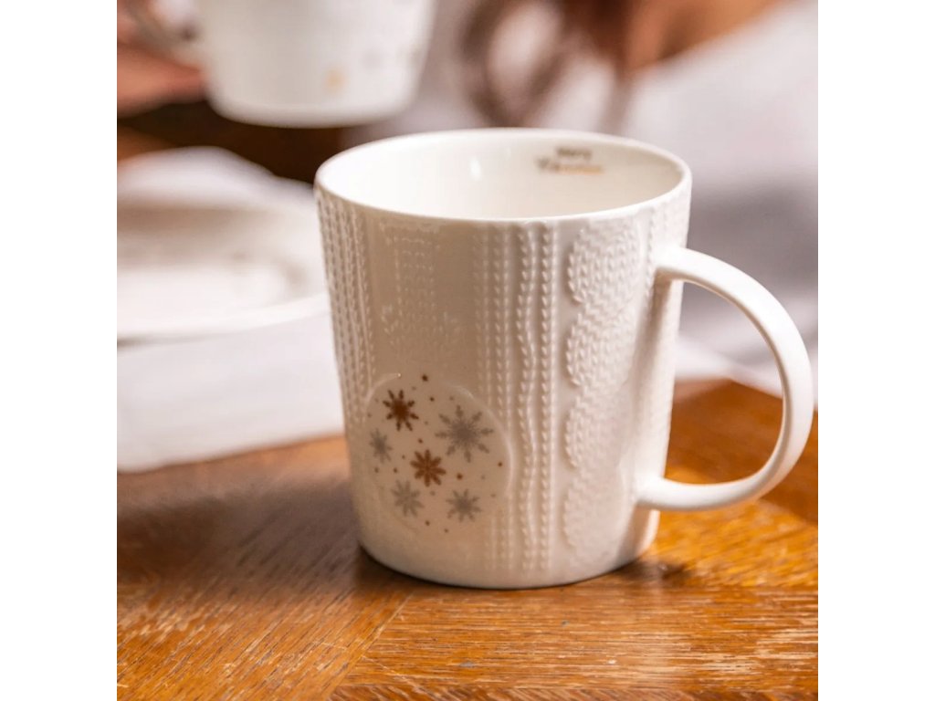 Nechajte sa uniesť kúzlom sviatočnej kolekcie Zimný lesk. Tento porcelánový hrnček s objemom 380 ml vyniká jemným reliéfnym vzorom pleteniny a zlatými a striebornými vločkami, ktoré prežiaria každé zimné ráno. Vo vnútri sa ukrýva zlatý nápis „Merry Christmas“ – malý detail, ktorý vyčarí úsmev pri každom dúšku teplého nápoja.