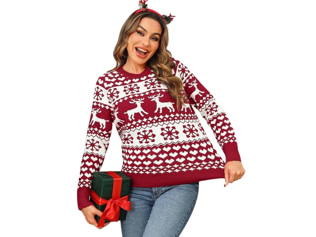 Dopraj si počas zimy štýl aj pohodlie s týmto dámskym vianočným svetrom v bordovo-bielej farbe. Vyrobený z jemného, hrejivého a pružného úpletu, perfektne sadne na postavu a poskytne príjemný pocit tepla počas chladných dní. Je ideálny na vianočné večierky, sviatočné fotenia či pohodové zimné dni.