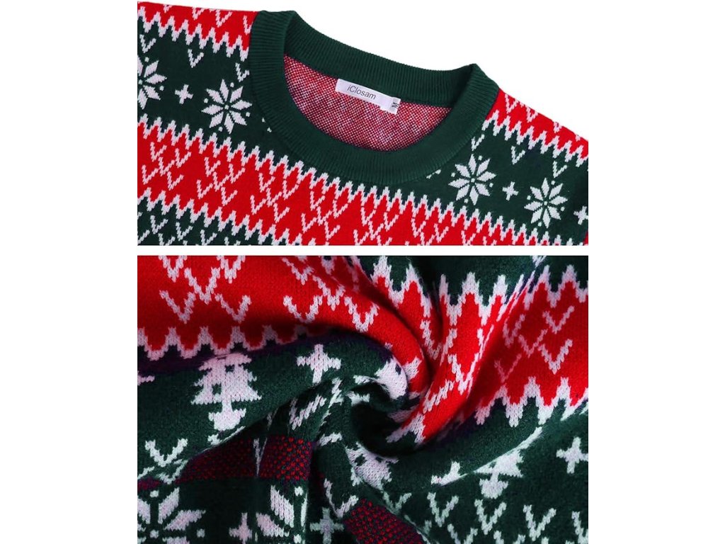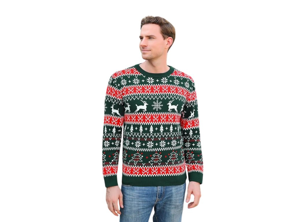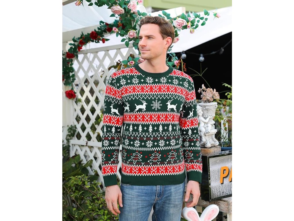 Pánsky vianočný sveter so sobmi a stromčekmi – zeleno-červený sveter s vločkami a severským vzorom