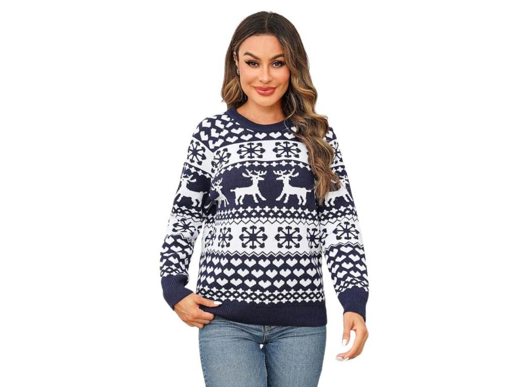 Dámsky vianočný sveter so sobmi – modro-biely sveter s vločkami a srdiečkami